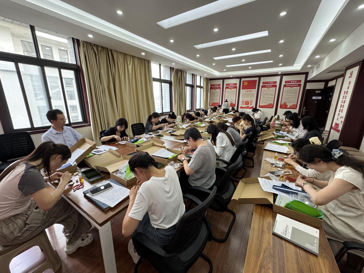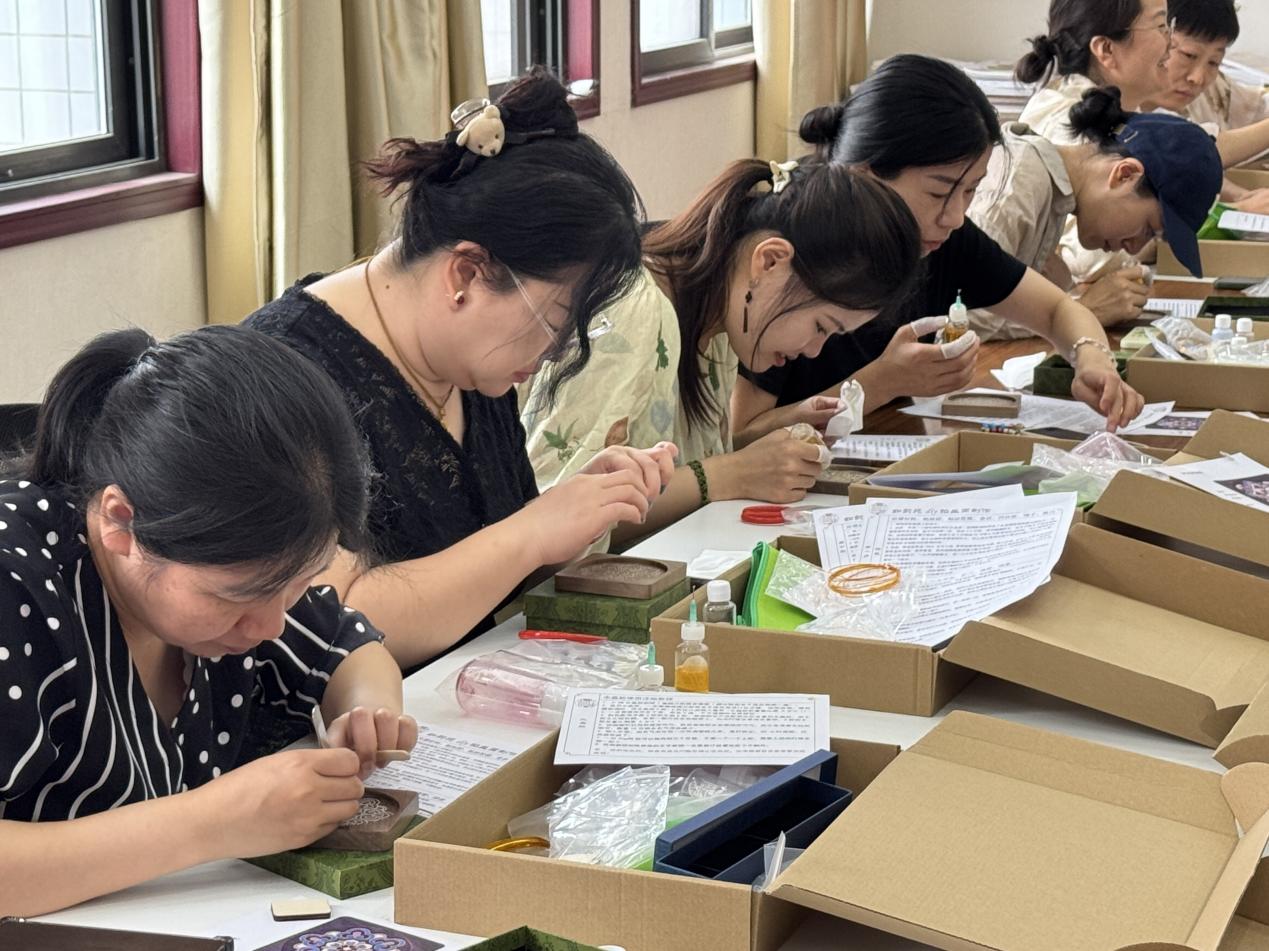 随后的实践环节将活动推向高潮。教职工们分组围坐,全身心投入到掐丝珐琅茶杯垫的制作中。他们手中拿着镊子和剪刀,将铜丝精心弯曲成敦煌藻井图案,再小心翼翼地填充珐琅釉料。在有限的时间内,大家充分发挥创意,有的追求图案的精细复刻,有的则融入现代元素进行创新设计,现场气氛热烈而专注,洋溢着对艺术的热爱与追求。经过一个半小时的努力,一个个独具匠心的掐丝珐琅茶杯垫初具雏形,在灯光下闪烁着别样的光彩,成为教职工们用心诠释敦煌文化的独特作品。