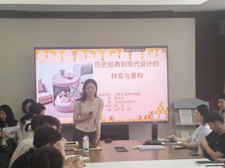 随后,五位教师从不同角度展示AI在设计与教学中的实践应用。孙雪老师以“AI在设计学院教学活动中的使用”为主题,介绍其在课程设计、创意启发等方面的应用案例,展现AI提升教学效率与学生参与感的作用;任鑫老师聚焦“数字影像创作”,讲解AI在图像生成、风格迁移、视频剪辑等环节的技术实现与艺术表现,为数字媒体艺术专业提供新创作思路;朱梦瑶老师以“人工智能与环境设计”为切入点,分享AI在空间分析、方案生成等方面的辅助作用,体现科技与人文结合的设计理念;杨涵老师以“历史经典到现代设计的转变与重构”为题,探讨借助AI工具对传统元素智能分析与再创造,实现文化传承与当代设计有机融合;刘海姣老师现场演示“豆包 + 即梦AI极速生成室内外效果图”操作,展现AI在快速方案表达与设计推演中的高效能力,为环境设计与建筑表现提供新技术路径。